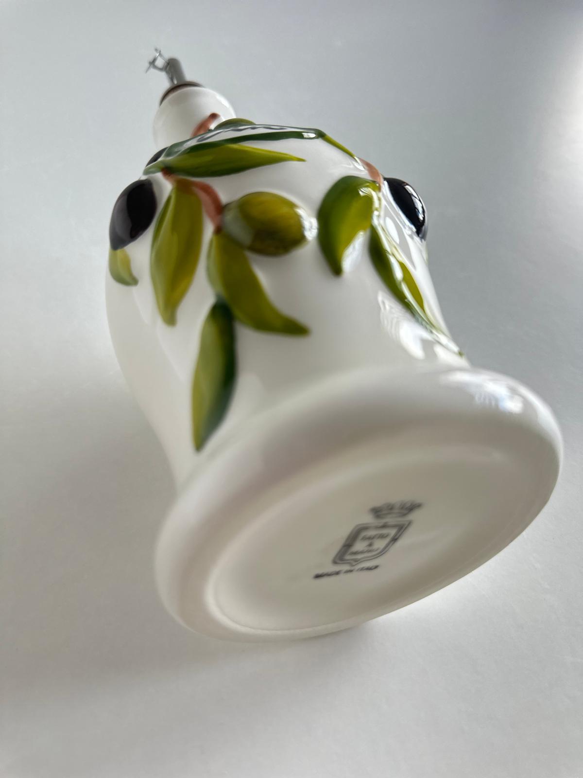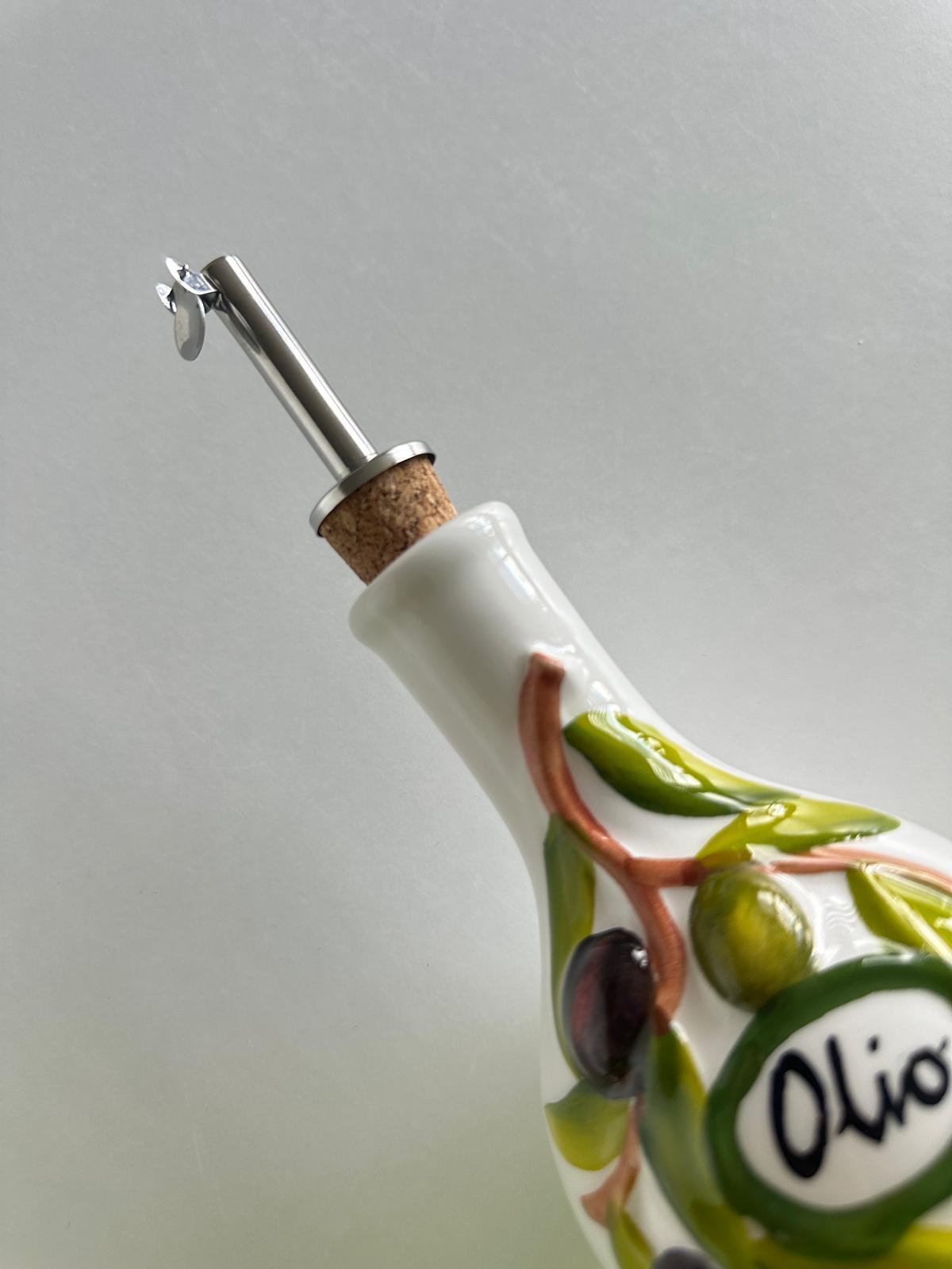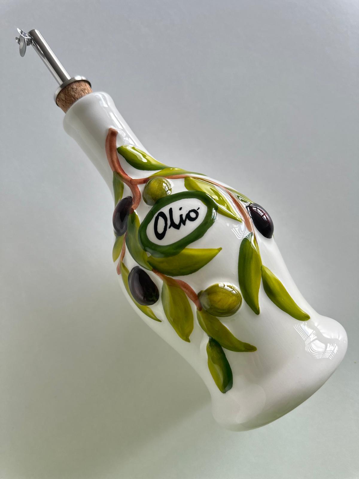 Elegancka ceramiczna butelka na oliwę o klasycznym, lekko pękatym kształcie. Wykonana z białej, szkliwionej ceramiki, przyciąga wzrok bogatą, ręcznie malowaną dekoracją 3D. Na powierzchni widoczny jest wypukły motyw gałązek oliwnych z liśćmi i oliwkami w odcieniach zieleni, brązu i głębokiej czerni, nadający całości naturalnego, śródziemnomorskiego charakteru.