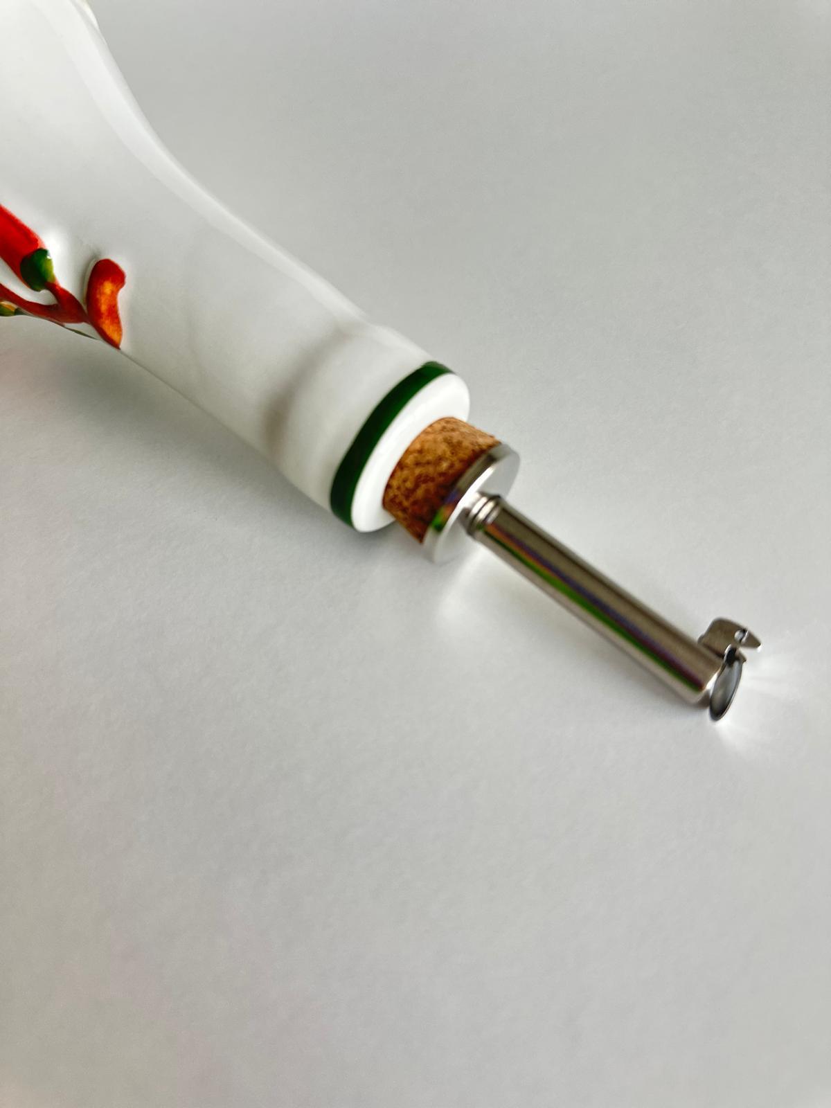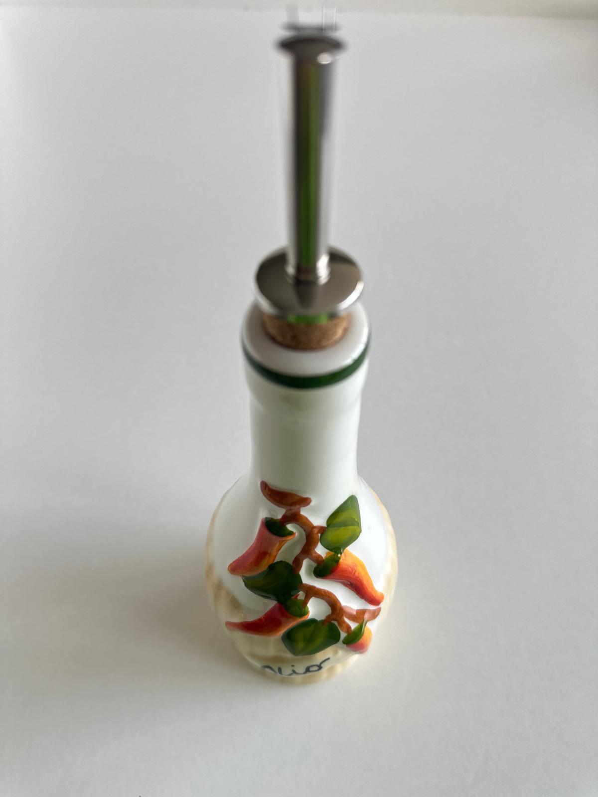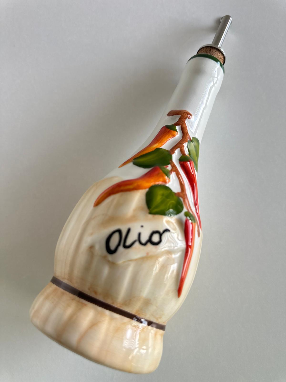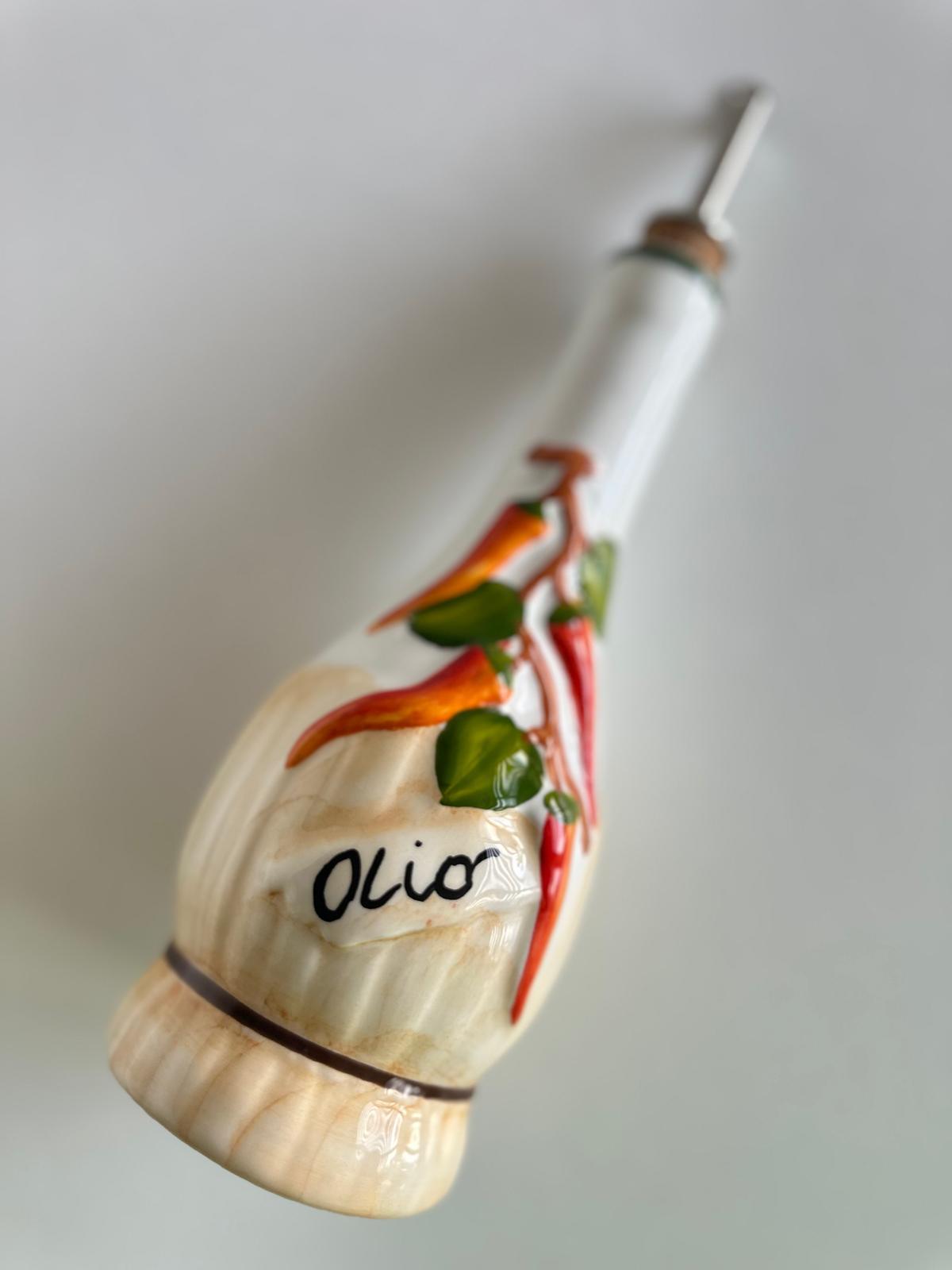 Oryginalna włoska butelka ceramiczna na oliwę z napisem "Olio" i dekoracją w postaci papryczek chili. Ręcznie formowana i malowana – każdy egzemplarz to unikat. Idealna do przechowywania i serwowania oliwy z oliwek w śródziemnomorskim stylu.