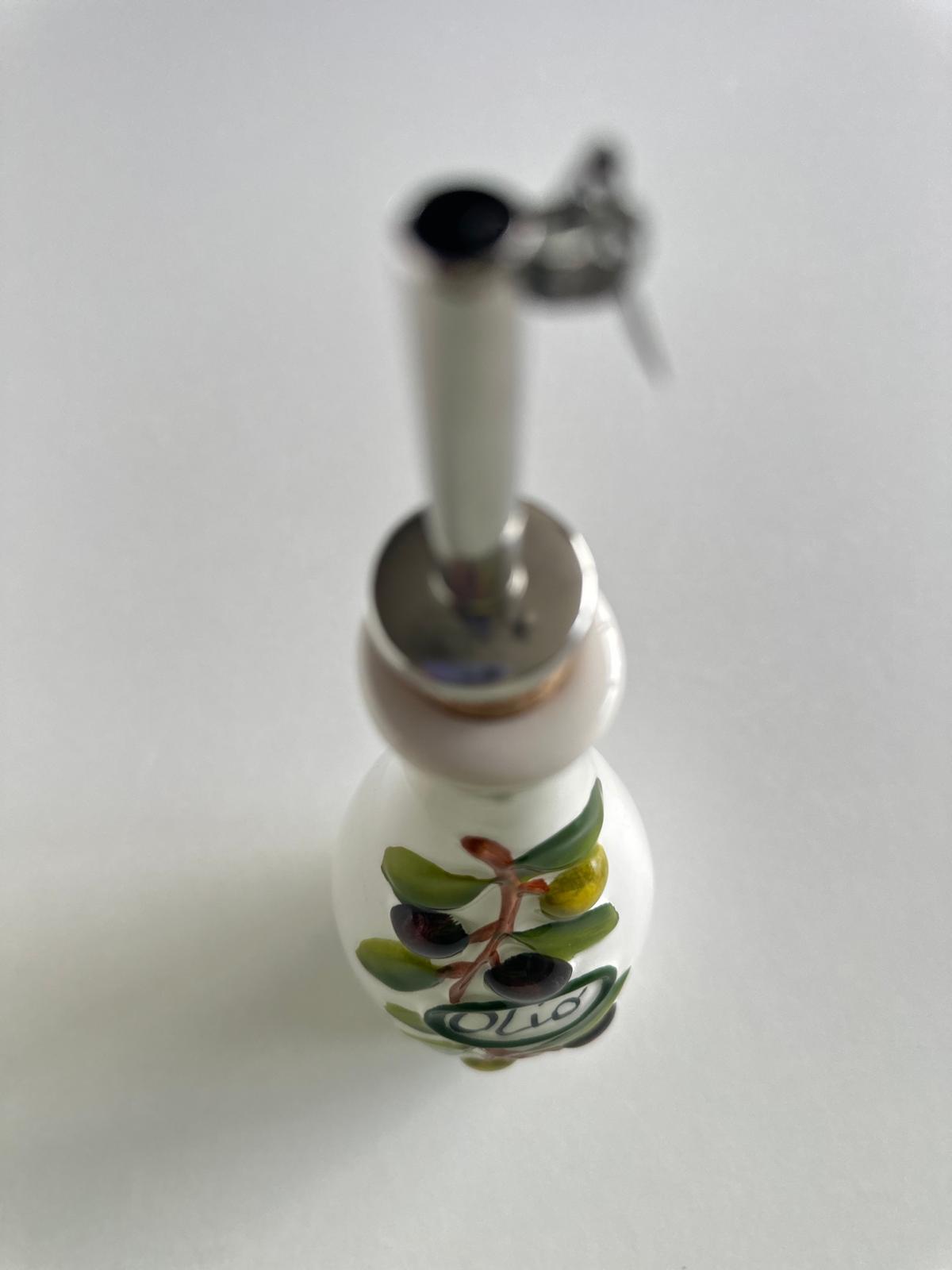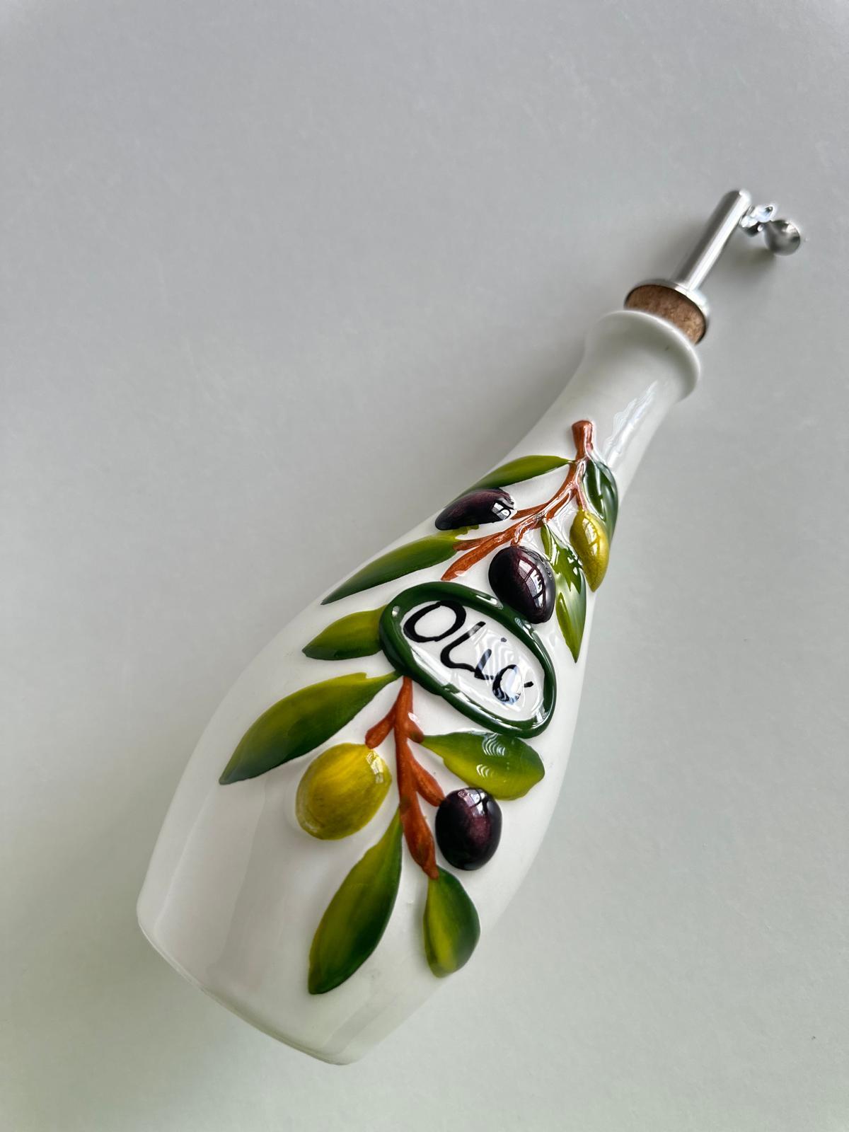 Butelka na oliwę z włoskiej ceramiki to połączenie funkcjonalności i stylu. Jej charakterystyczny, lekko wypukły dół nadaje oryginalny kształt i stabilność, a ręcznie malowany motyw oliwek 3D w naturalnych odcieniach zieleni i fioletu podkreśla śródziemnomorski klimat. Wysokiej jakości ceramika sprawia, że naczynie doskonale chroni oliwę przed światłem, zachowując jej świeżość. Idealna do codziennego użytku w kuchni, jak i jako elegancki akcent na stole. Świetnie sprawdzi się również jako pomysł na stylowy, praktyczny prezent.