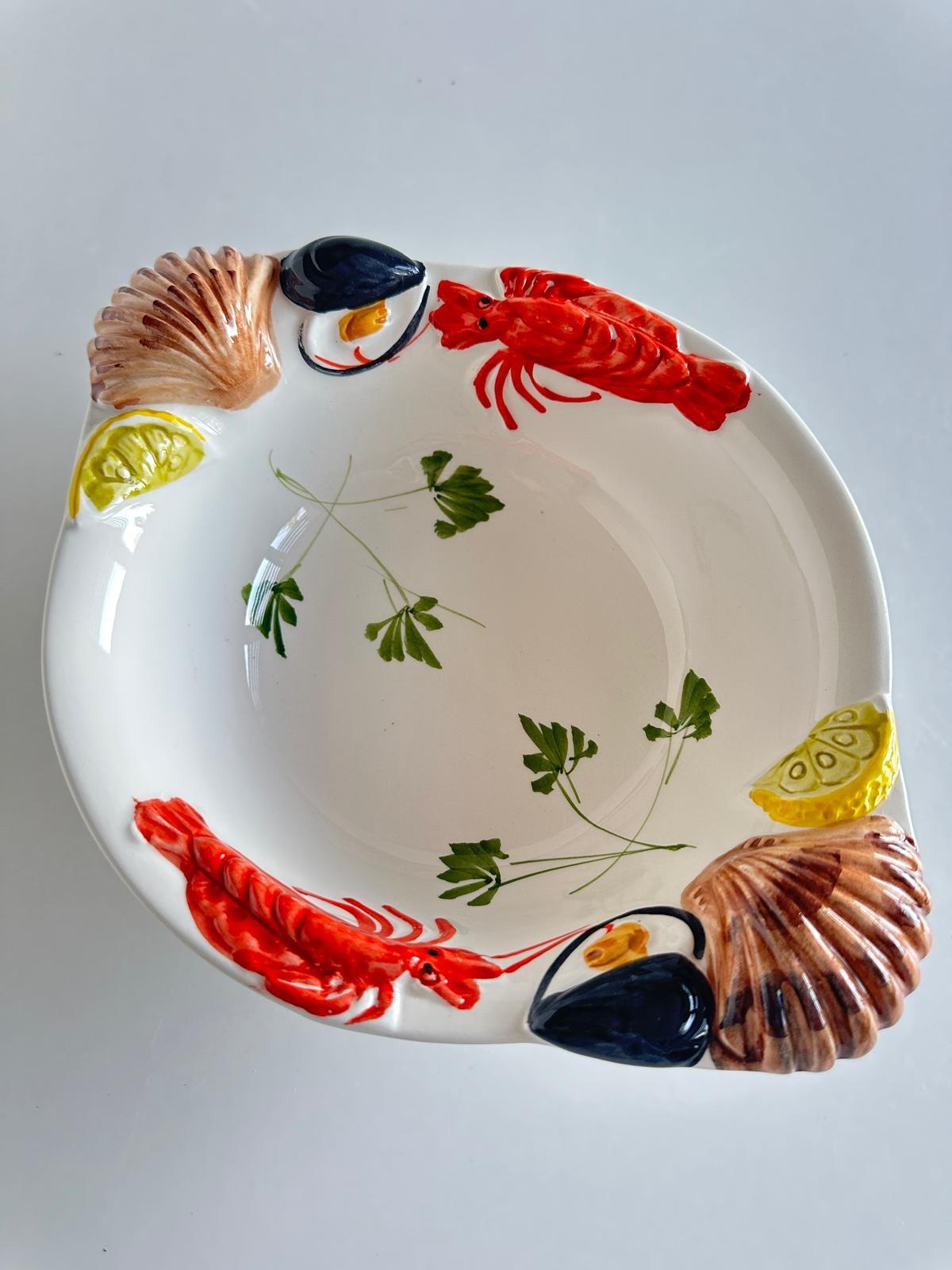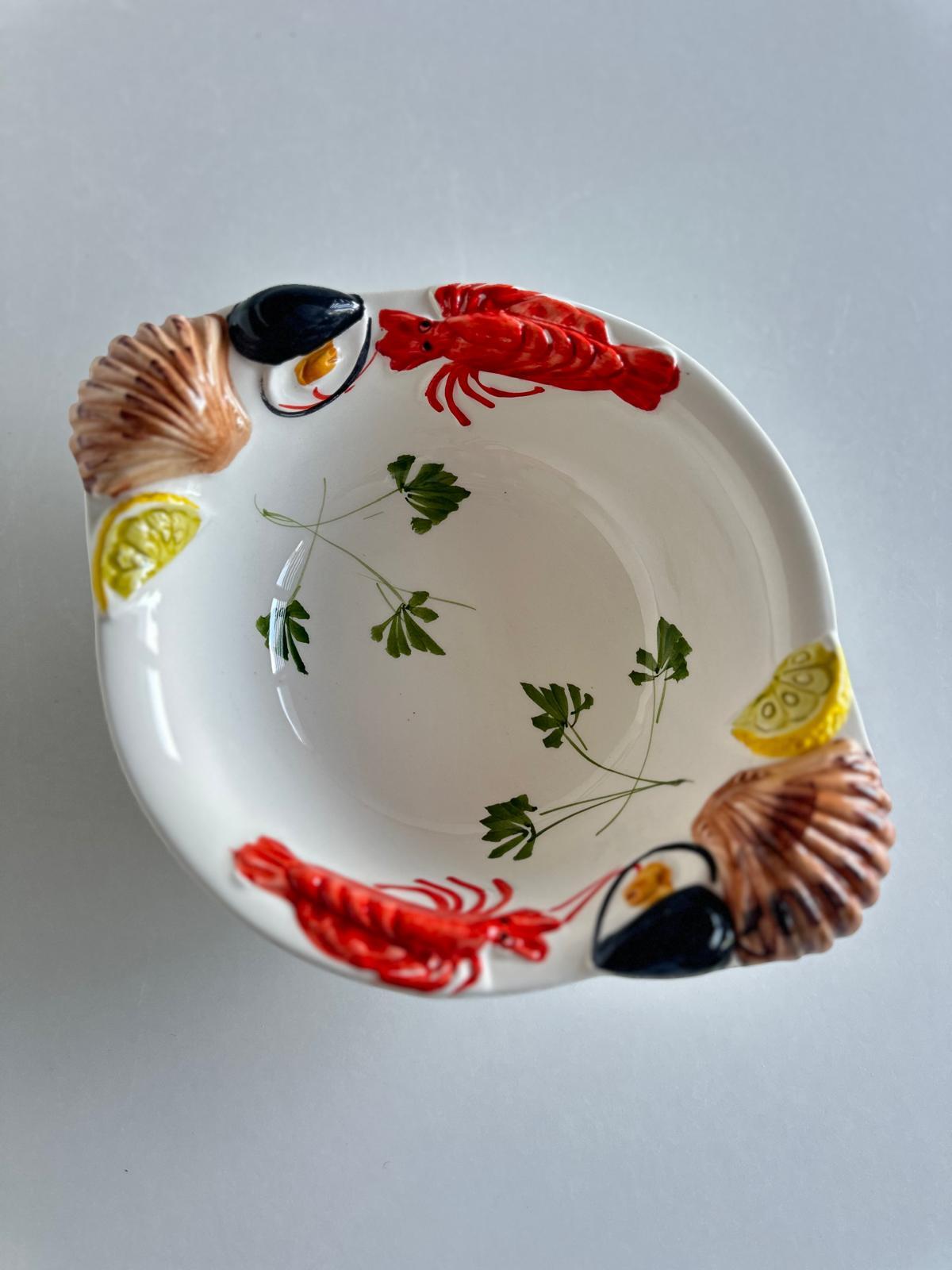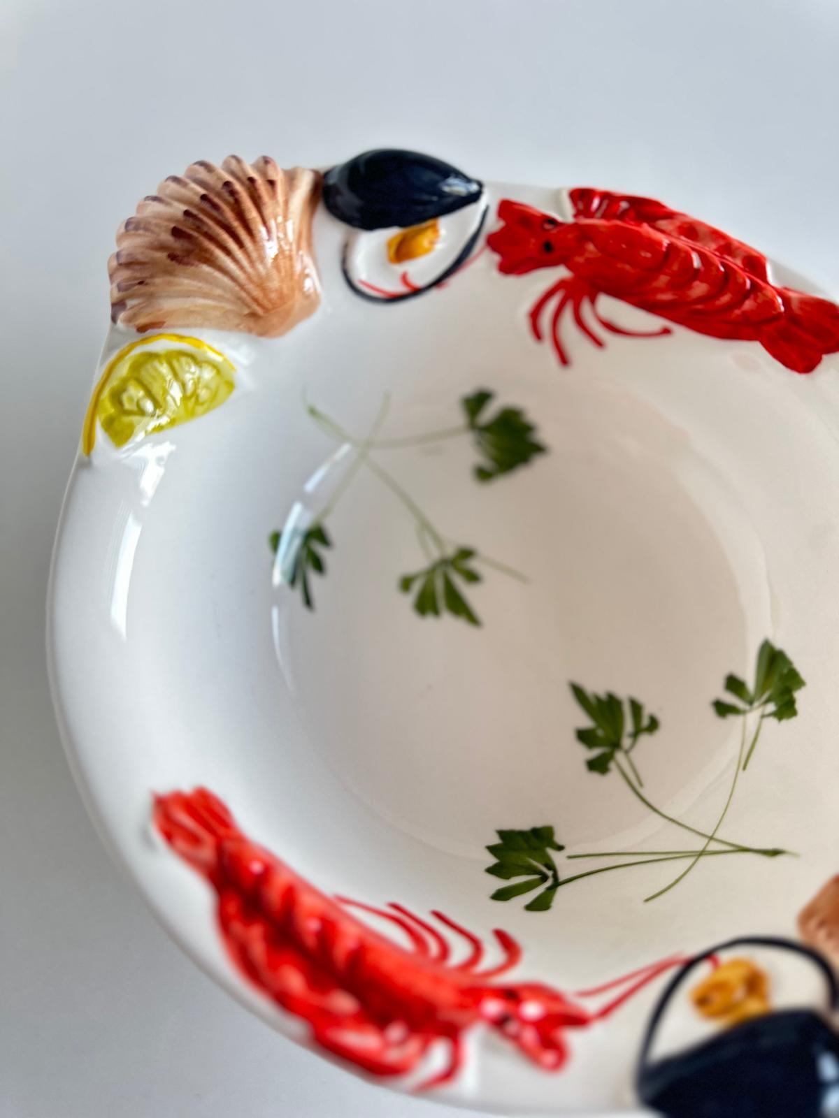 Średniej wielkości ceramiczna miseczka o wyjątkowym, śródziemnomorskim charakterze. Wykonana z wysokiej jakości ceramiki, zachwyca ręcznie zdobionym rantem z motywami owoców morza – homarów, muszli oraz cytryn, które nadają jej niepowtarzalny, dekoracyjny wygląd. Wnętrze miseczki ozdobione jest delikatnym wzorem zielonych listków, co dodaje jej lekkości i świeżości.