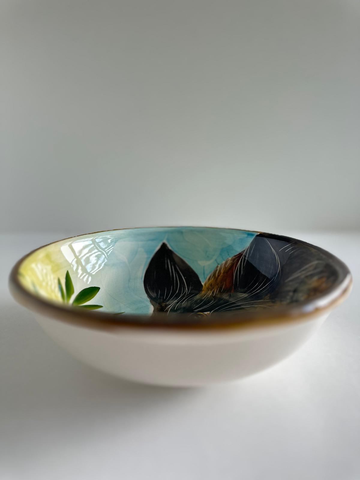 Tło malowane jest miękko cieniowanymi przejściami kolorów – od jasnozielonego po turkusowy, co nadaje całości lekkości i przestrzeni. Dekorację dopełniają zielone gałązki – prawdopodobnie rozmarynu – które podkreślają leśny, rustykalny charakter naczynia.