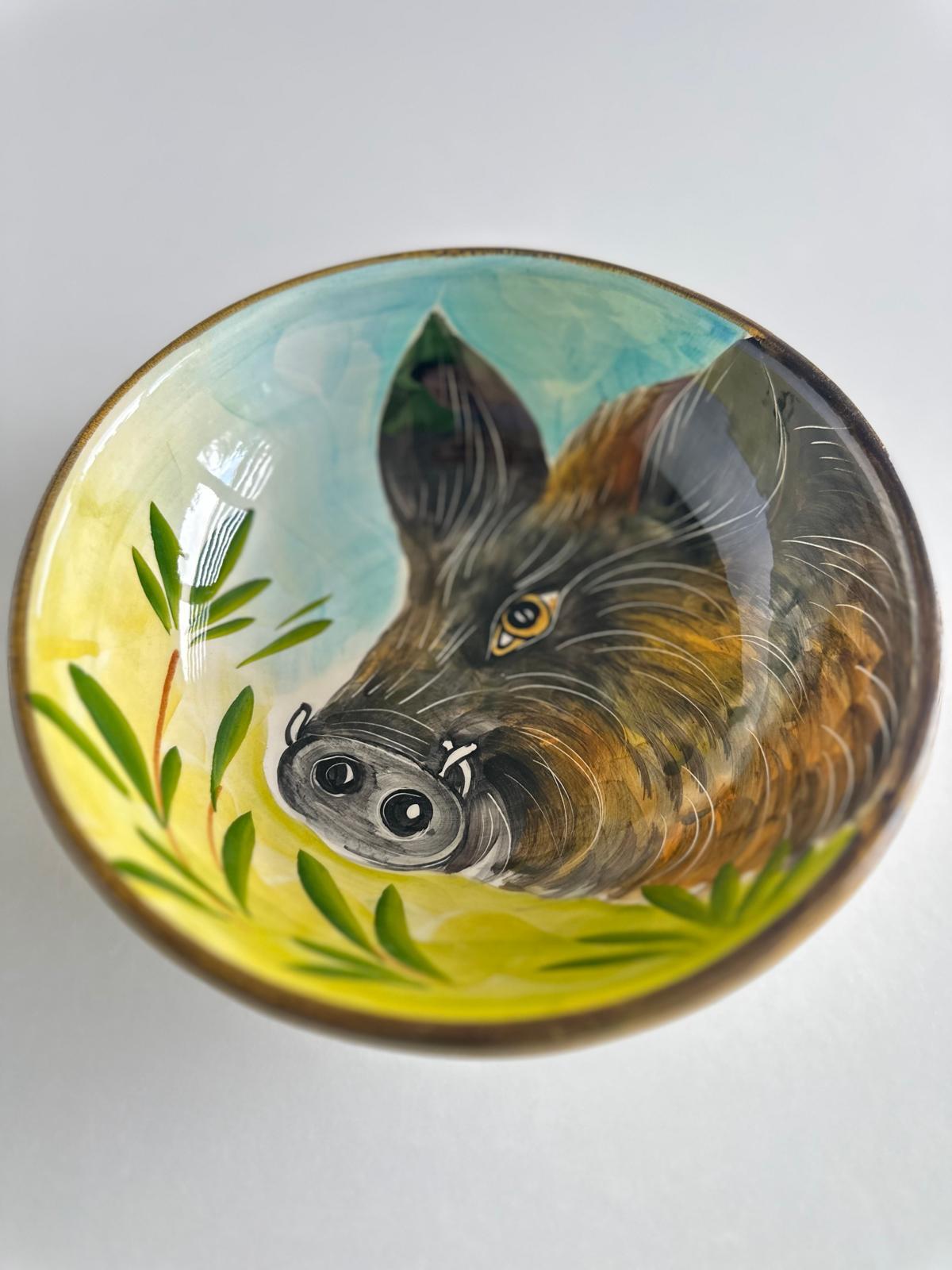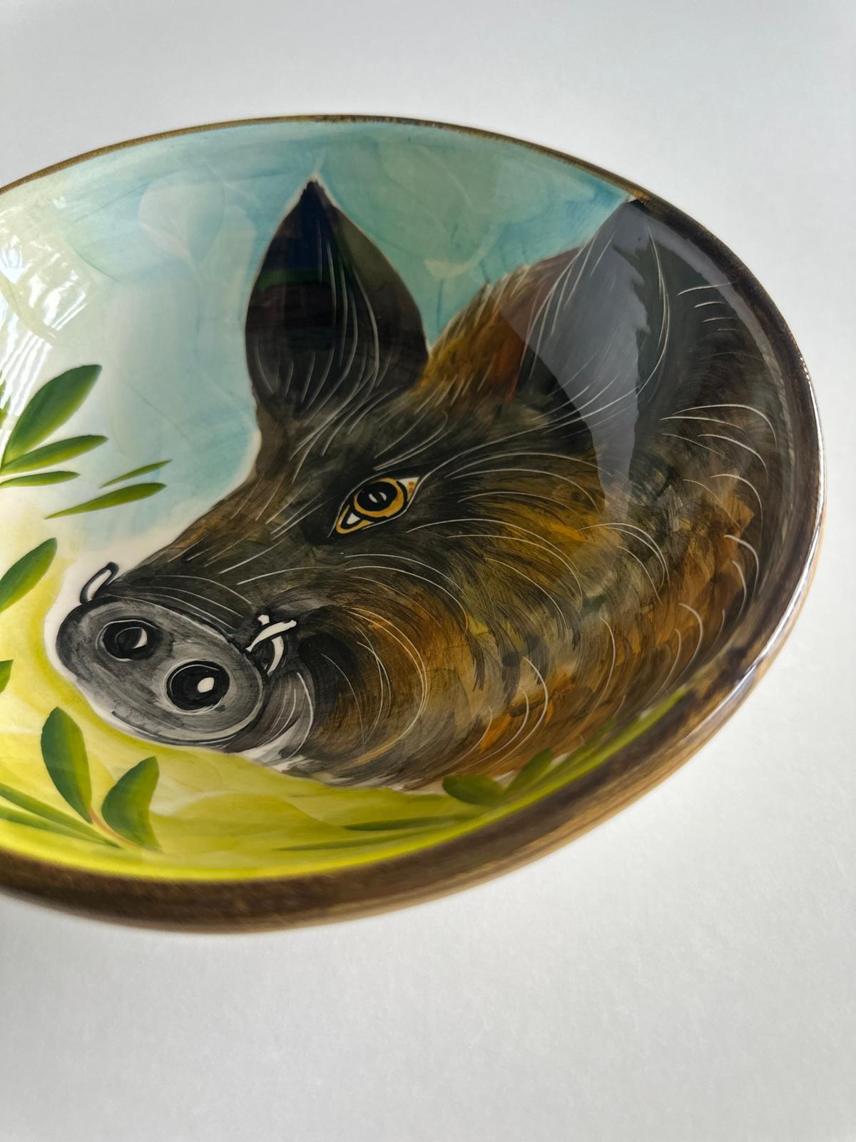 Okrągła miseczka ręcznie malowana, utrzymana w naturalnej, toskańskiej stylistyce. Na jej powierzchni znajduje się efektowny, szczegółowy portret dzika – dynamicznie przedstawiona głowa zwierzęcia z wyrazistym okiem i realistycznym futrem w odcieniach brązu, czerni i złota.