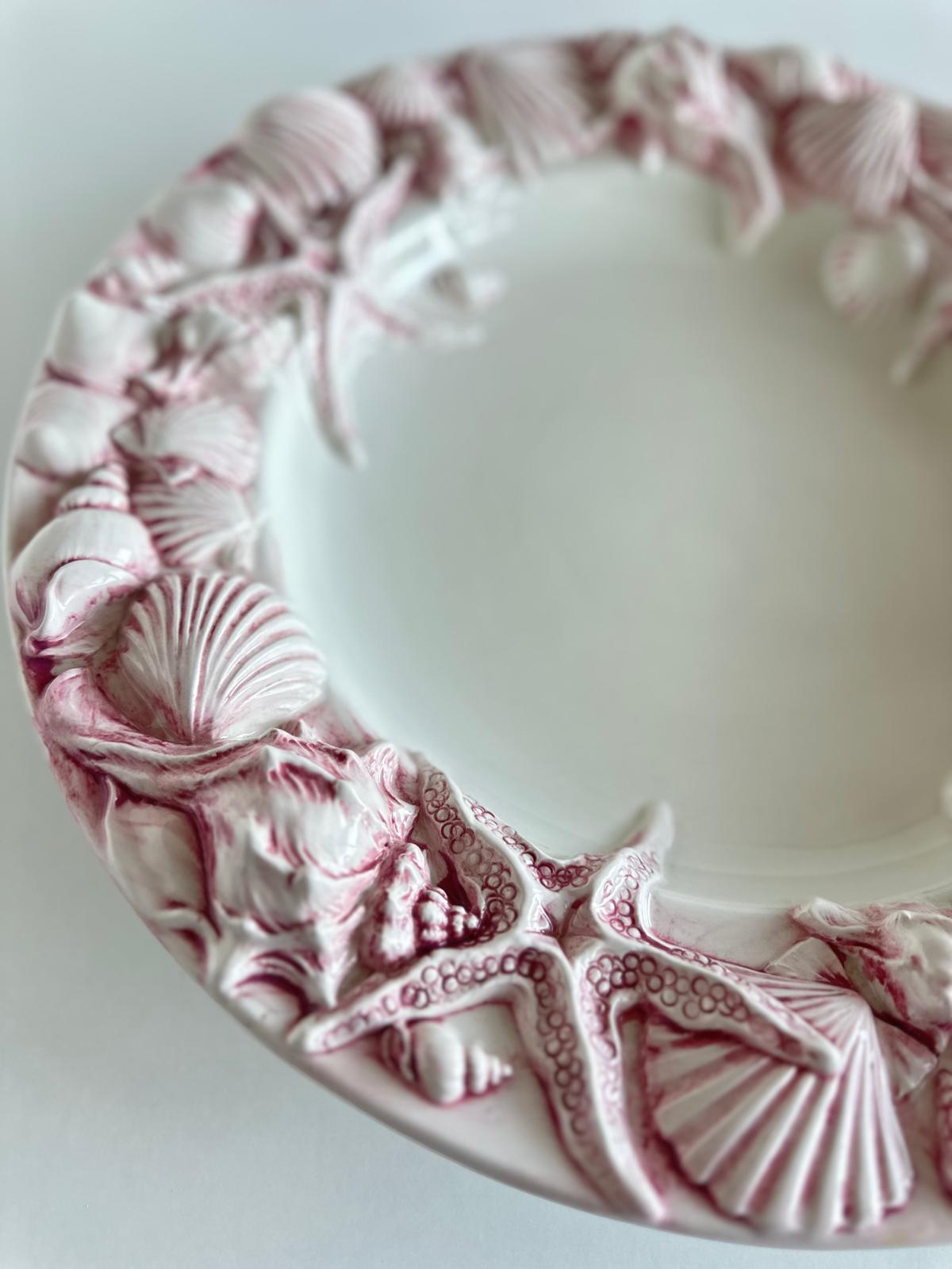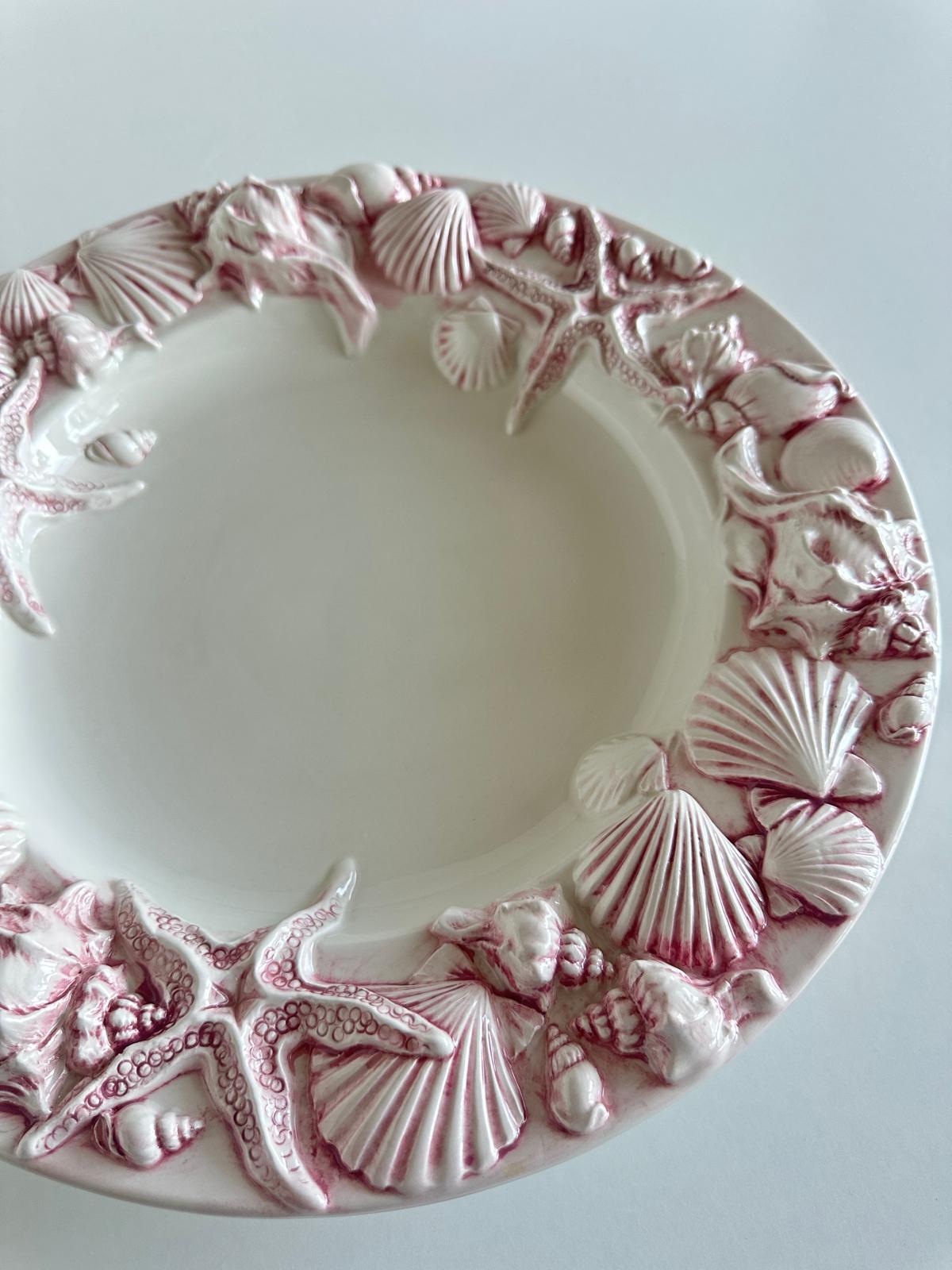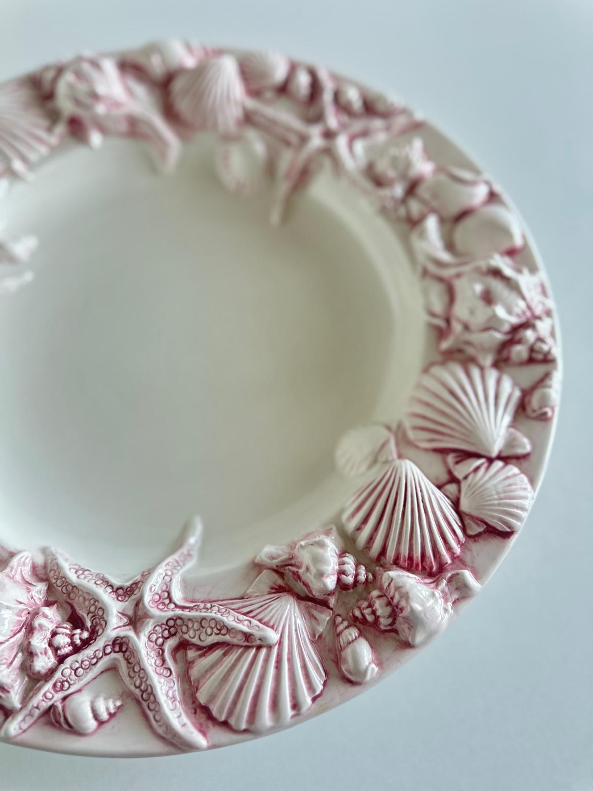 Wyjątkowy talerz inspirowany nadmorskim klimatem, który przyciąga uwagę bogato zdobionym rantem. Reliefowe muszle i rozgwiazdy w różowym wykończeniu pięknie kontrastują z delikatną, kremową bielą środka, tworząc efekt luksusu i lekkości.