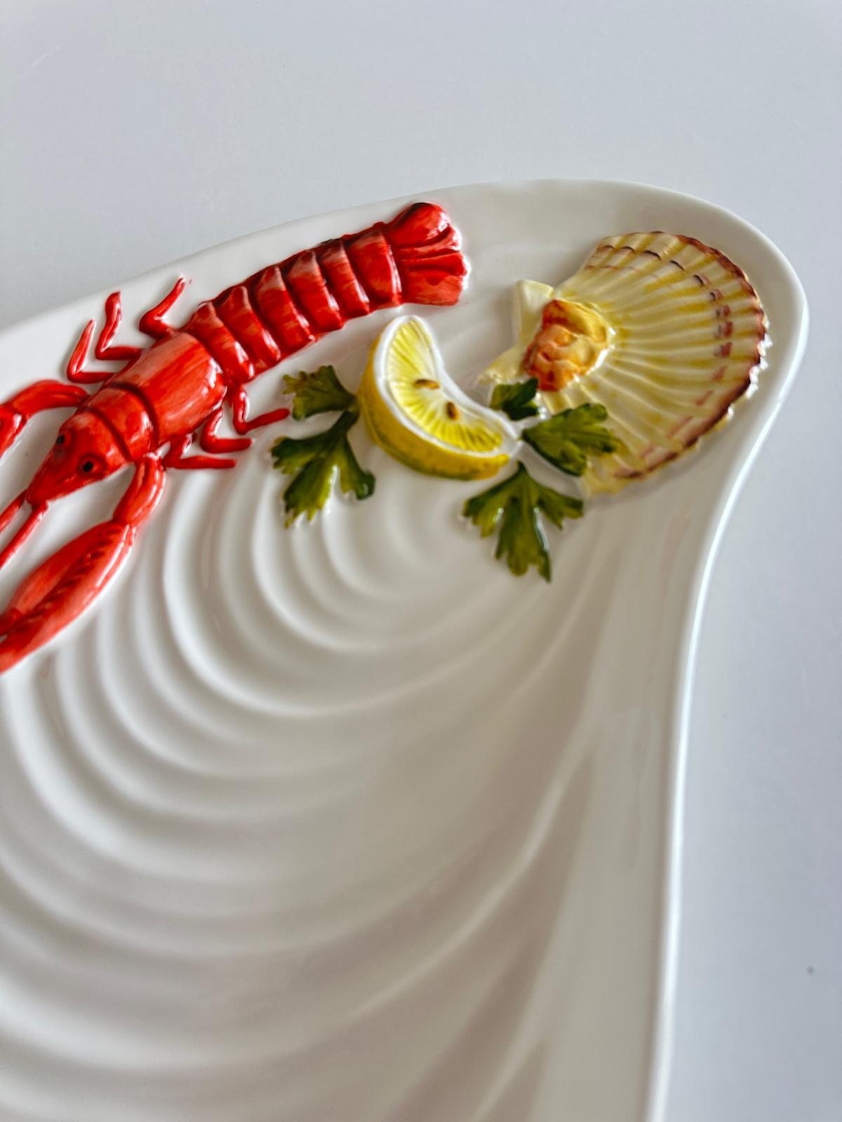 Półmisek został wykonany z wysokiej jakości ceramiki i wykończony subtelnym szkliwem, które podkreśla jego elegancję oraz trwałość. Na jego powierzchni znajduje się efektowna, trójwymiarowa dekoracja przedstawiająca kraba oraz cytrynę, dodająca całości wyjątkowego uroku i dekoracyjnej głębi.