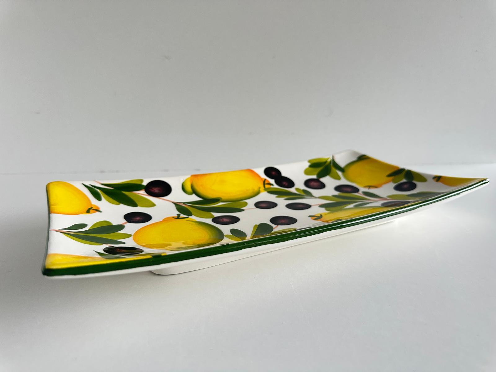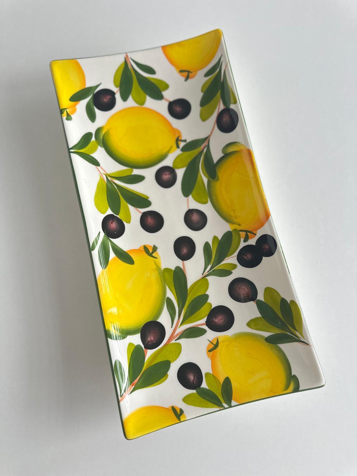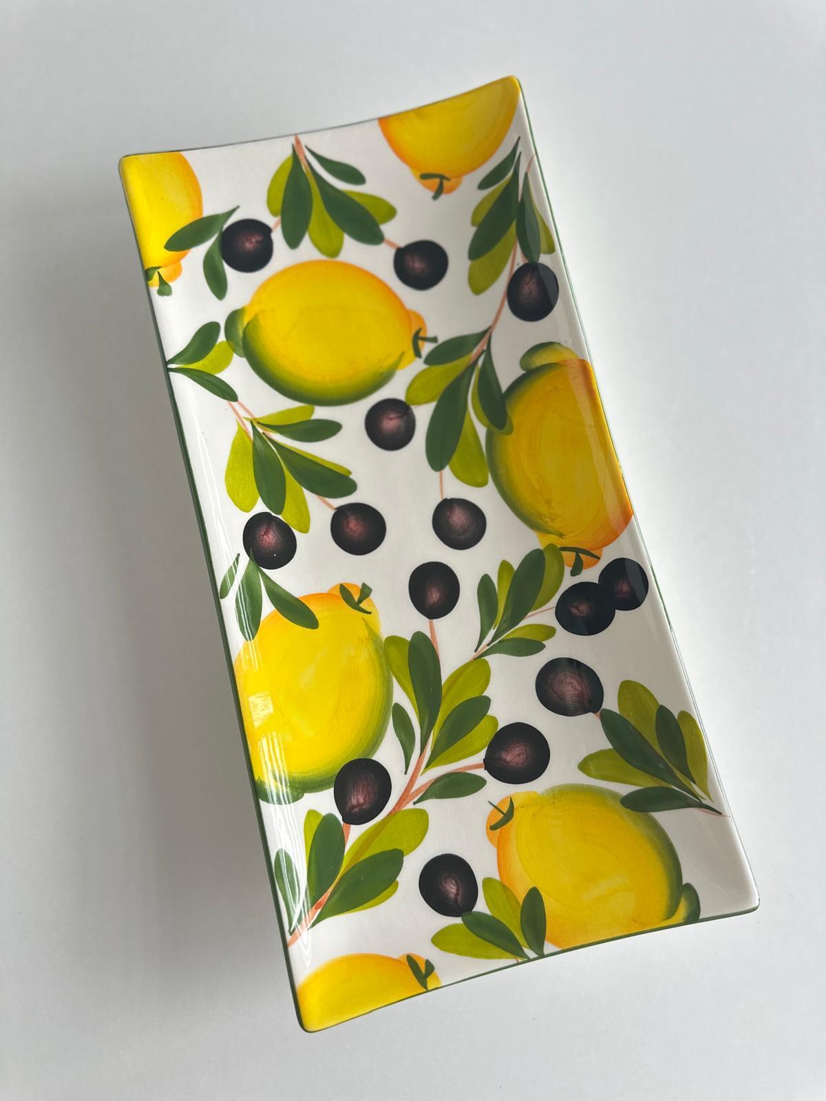 Średni półmisek prostokątny lekko wygięty ku górze. Ręcznie malowany wzór cytryn. Żywe kolory - soczysta żółć cytryn i zieleń liści i oliw nadają mu świeżości . Idealny do serwowania ciast, serów czy pieczywa. Jego smukły kształt i dekoracyjny wzór sprawiają że pięknie prezentuje się na stole.