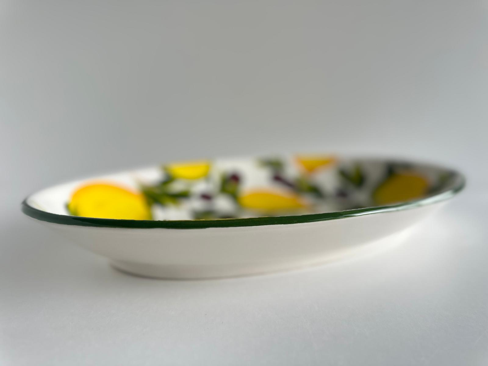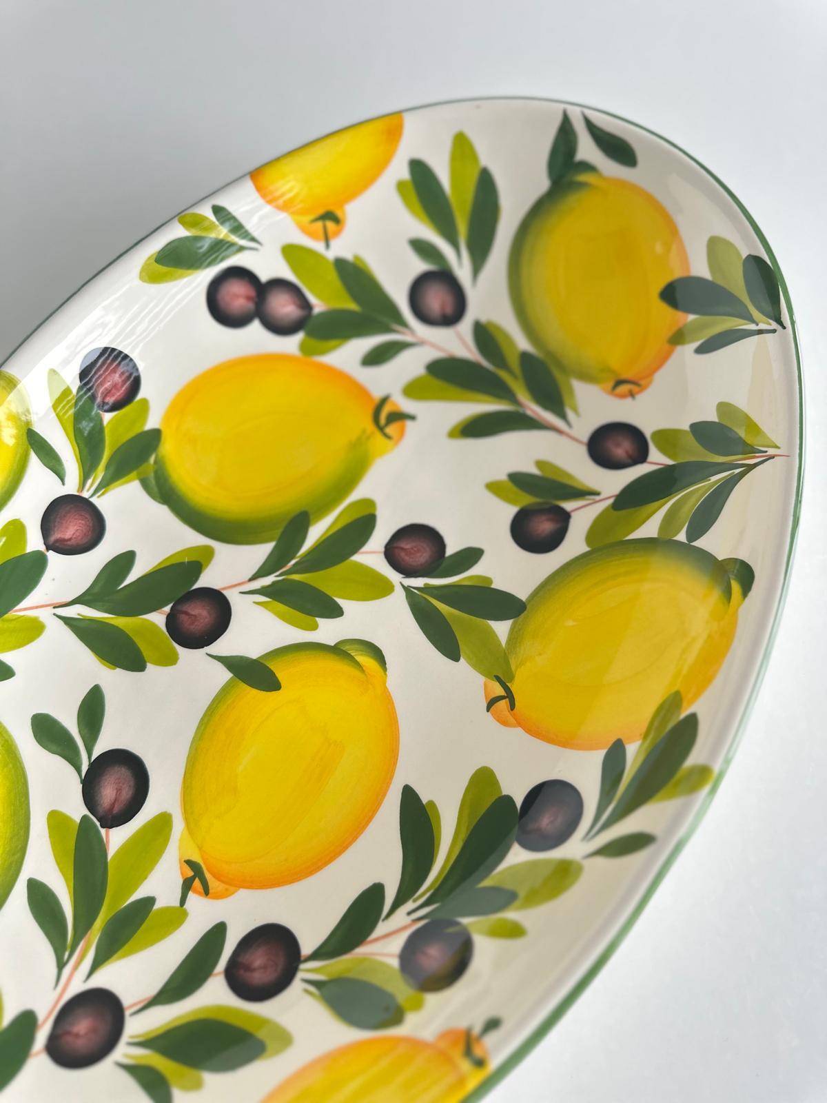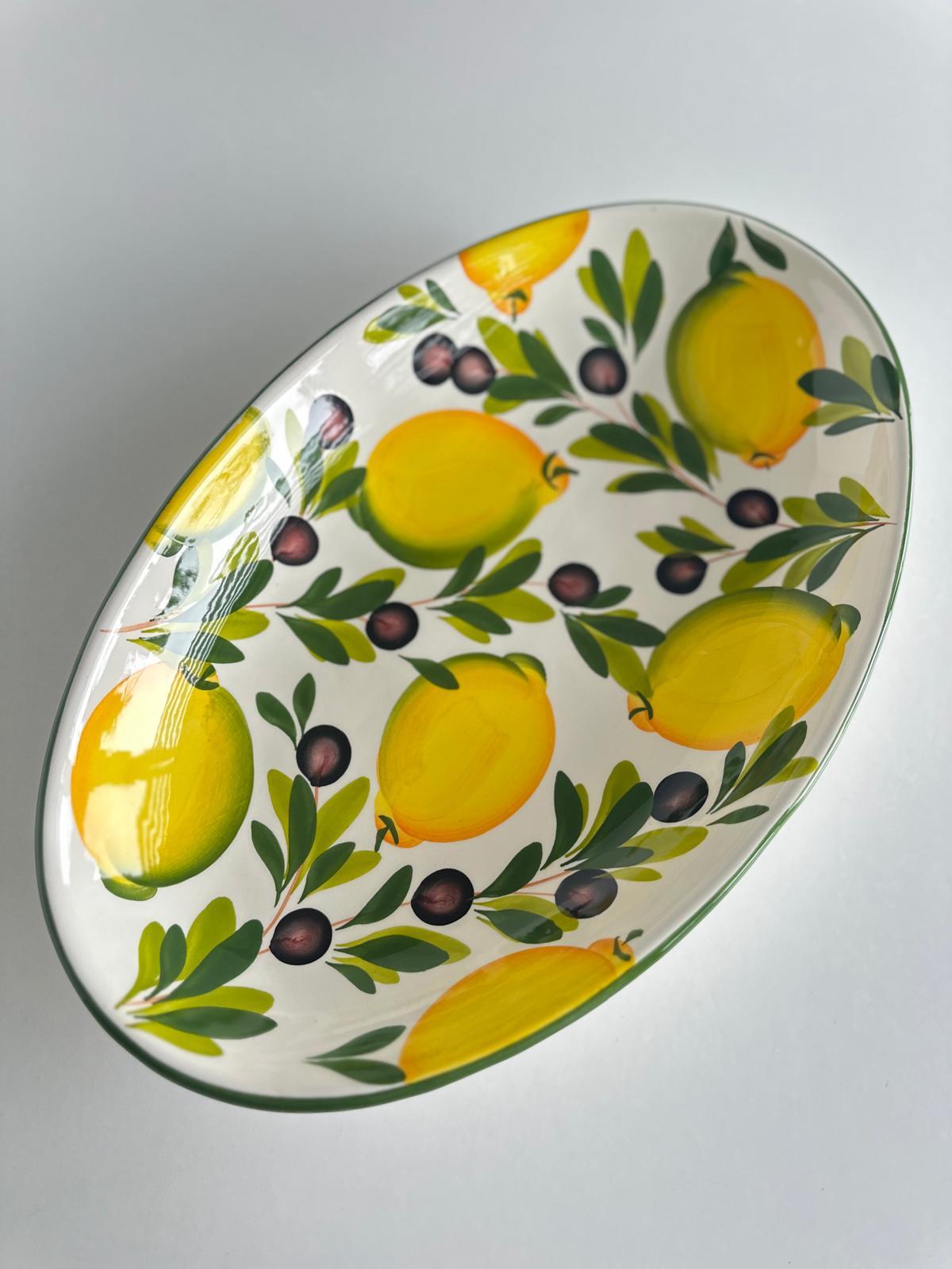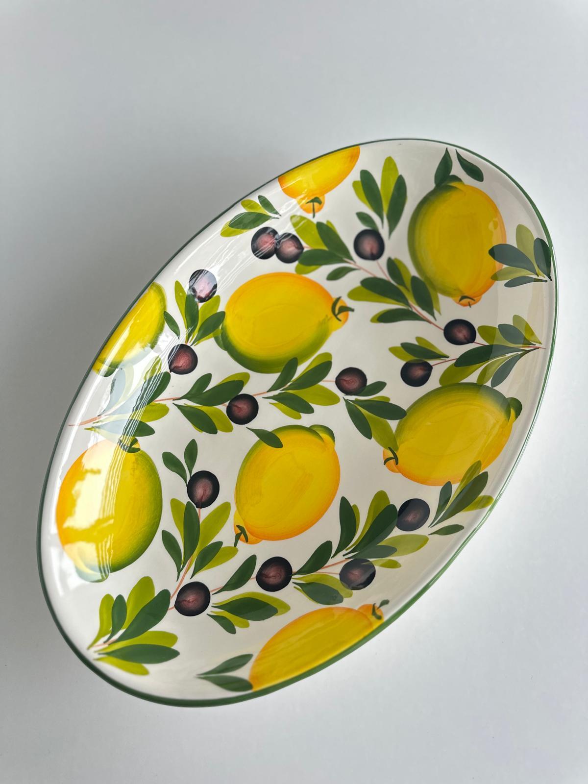 Owalny półmisek z ceramiki włoskiej to elegancki i funkcjonalny element zastawy, który doskonale sprawdzi się do serwowania przekąsek, serów, pieczywa czy owoców. Na jego płaskiej powierzchni ręcznie namalowano dojrzałe cytryny Ii oliwki w intensywnych barwach, wprowadzające śródziemnomorski klimat na stół. Każdy detal wzoru oddaje charakter rękodzieła – naturalny, ciepły i pełen uroku. Idealny do wnętrz w stylu prowansalskim, rustykalnym lub klasycznym, doda świeżości i koloru każdej aranżacji stołu.