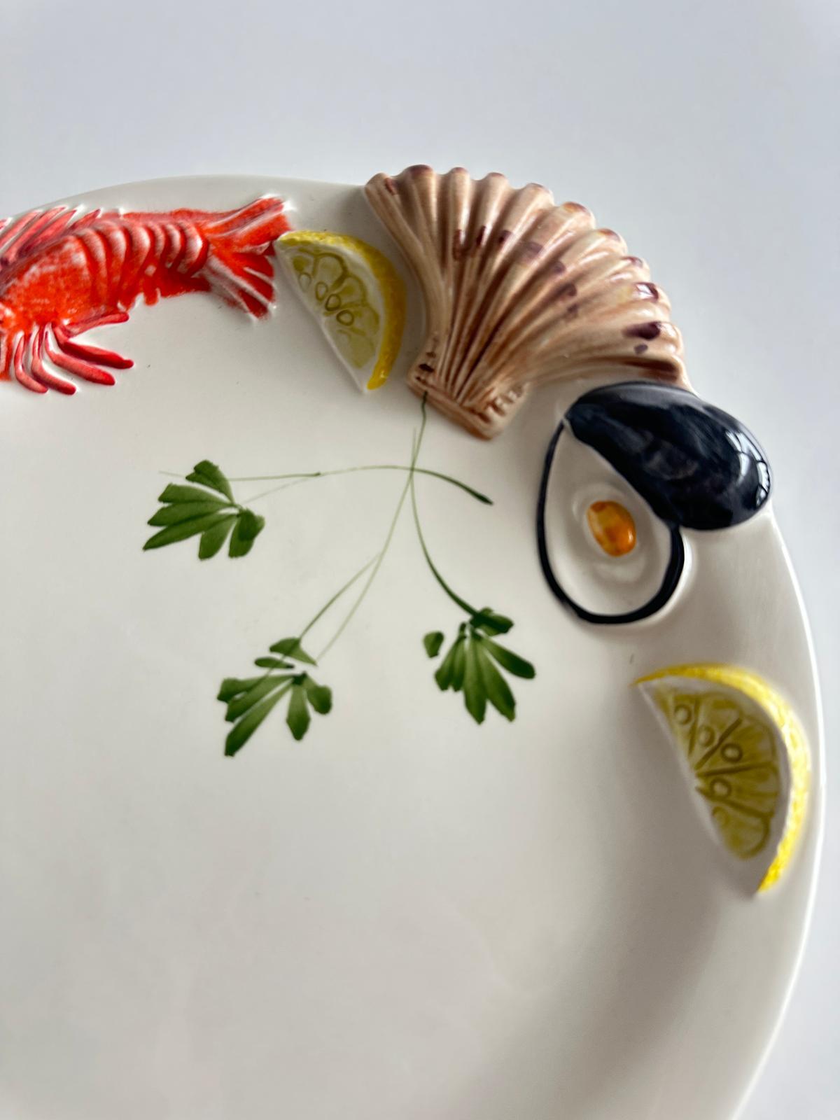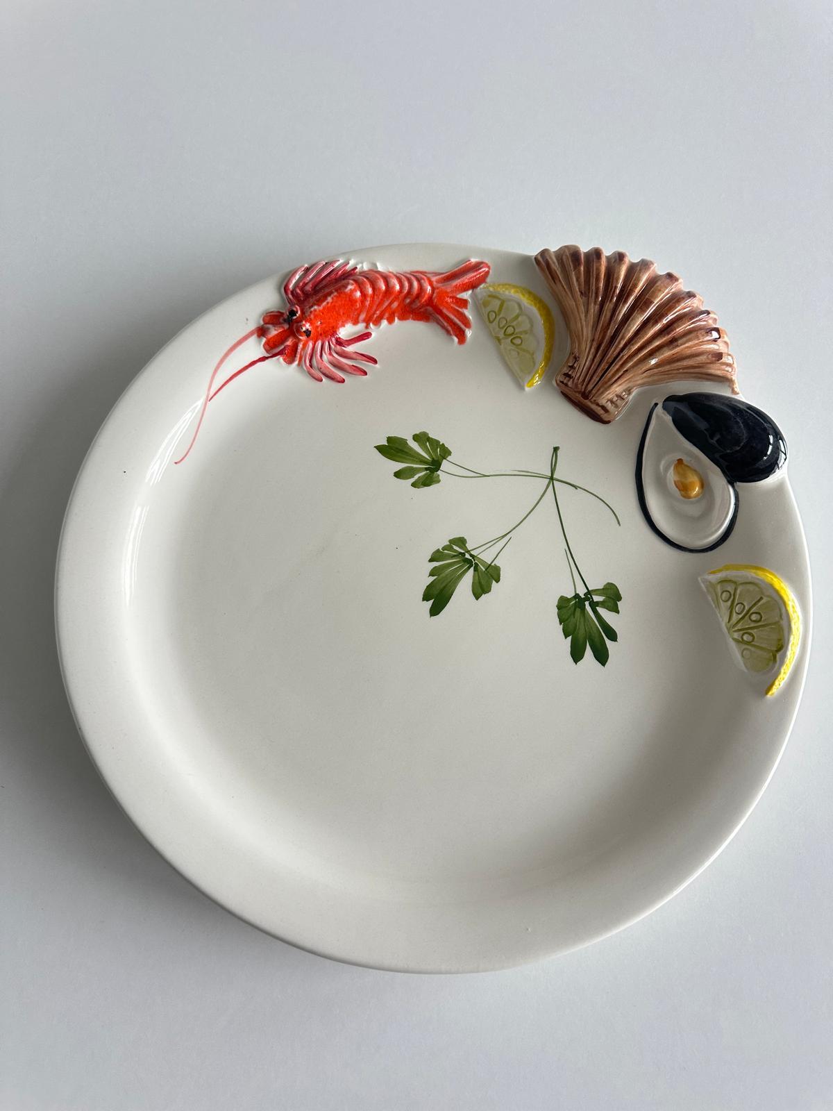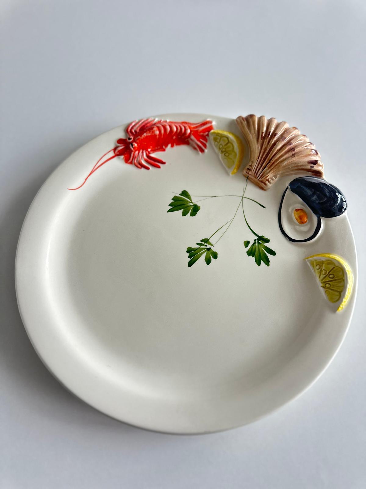 Okrągły talerz obiadowy z włoskiej ceramiki w odcieniu klasycznej bieli. Brzeg zdobią dekoracje 3D, przedstawiające elementy morskiej kuchni: czerwonego homara, muszlę św. Jakuba, czarną małżę, ćwiartki cytryny oraz zieloną natkę pietruszki. Każdy element jest ręcznie malowany, wypukły, starannie dopracowany i realistyczny, co nadaje talerzowi wyjątkowego, artystycznego charakteru.