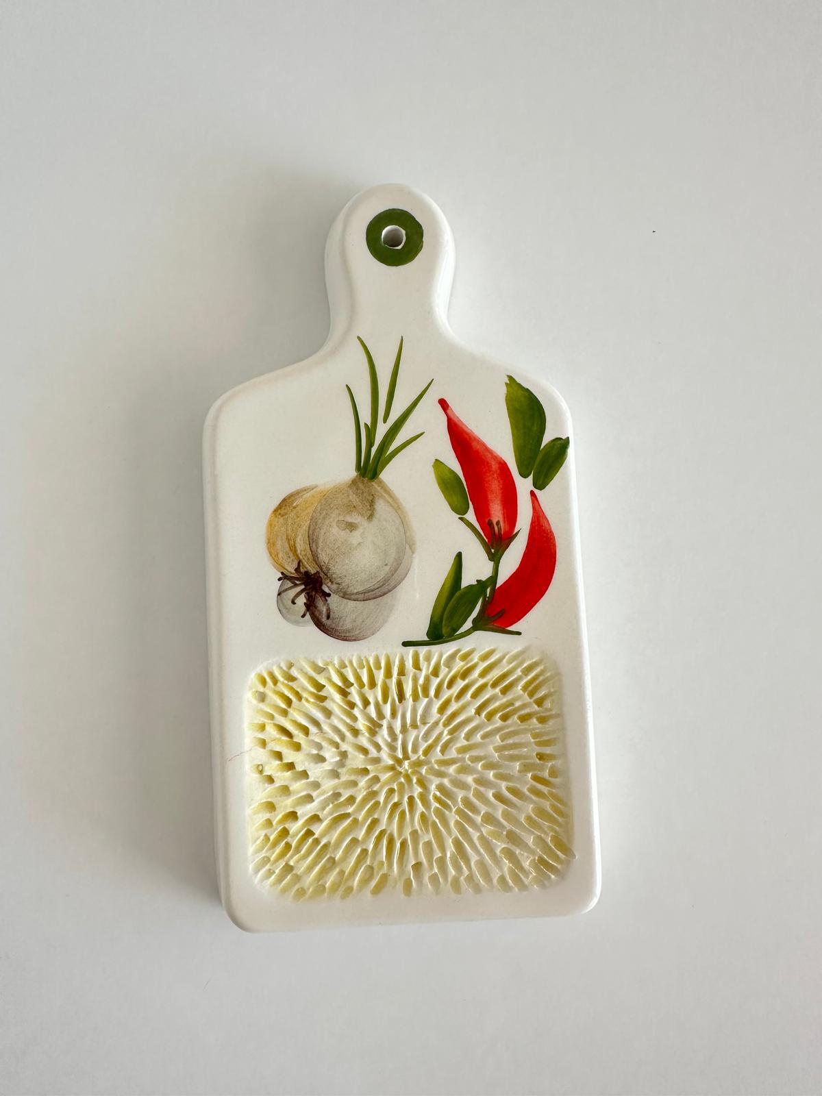 Ceramiczna deseczka do tarcia czosnku z chropowatą powierzchnią, wykonana z włoskiej ceramiki. Ręcznie malowana, z dekoracyjnym motywem czerwonej papryczki chilli, łączy funkcjonalność z estetyką. Idealna do szybkiego i wygodnego rozcierania czosnku, imbiru lub innych przypraw. Stylowy i praktyczny dodatek do każdej kuchni w śródziemnomorskim klimacie.